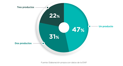 Las personas que tienen tres productos son una minoría con el 22% de la población sobre la que se hace el análisis y el 13.5% de la población total. Esto indica que la inclusión financiera amplia es limitada en México.